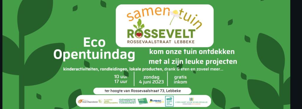 -> Samentuin Rossevelt. Op 4 juni zijn we uitgenodigd op de Eco Opentuindag van Samentuin Rossevelt. Van 10u tot 17u kan je de tuin en de verschillende fantastische projecten ontdekken. Wij mogen er onze groentjes aanbieden. Je vindt de Samentuin ter hoogte van de Rossevelstraat 73 in Lebbeke. Kom eens langs, het is zeker de moeite waard.