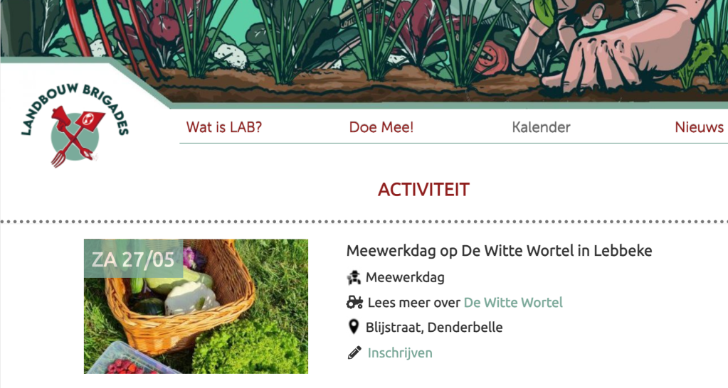 -> Meewerkdag op de Witte Wortel. Op zaterdag 27 mei kan je via de Landbouwbrigades van 10u tot 16u meewerken op het veld. De brigades brengen burgers met verschillende achtergronden samen om de boerenlandbouw te verdedigen, het recht op gezonde voeding op te eisen, de agro-ecologische beweging te versterken, de transitie naar een écht duurzame samenleving te bespoedigen en bij te dragen aan een landbouwmodel dat gebaseerd is op de principes van voedselsoevereiniteit. Schrijf je in door te klikken op deze link en kom mee wieden, hakselhout uitvoeren, planten, zaaien en schoffelen. De Landbouwbrigade zorgt voor de inschrijving en verzekering, jij zorgt voor lunch, gepaste kledij en flinke dosis enthousiasme en wij zorgen voor het materiaal, een rondleiding, en een antwoord op je vragen.