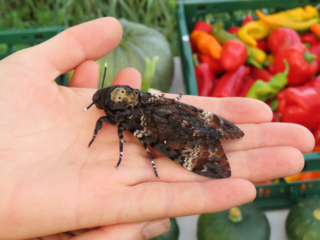 Donderdag jl. kregen we het fijne bericht van Ruben dat de tweede rups ontpopt is tot een stevige nachtvlinder. De tweede rups was langer en zwaarder. Ze kroop enkele dagen na de eerste rups in de grond en ontpopte dus voor de eerste. Met een lengte van zeven centimeter en een spanwijdte van dertien centimeter gaat het om een fors exemplaar. Veel groter worden nachtvlinders niet in Europa. Het nieuws werd opgepikt door vrt, HLN en het Nieuwsblad. Wie dit weekend op bezoek kwam op het veld, kon de doodskoptekening op deze mooie dame in levende lijve bekijken. Nu is het wachten op de ontpopping van de eerste rups/pop, een mannetje. We houden jullie op de hoogte.