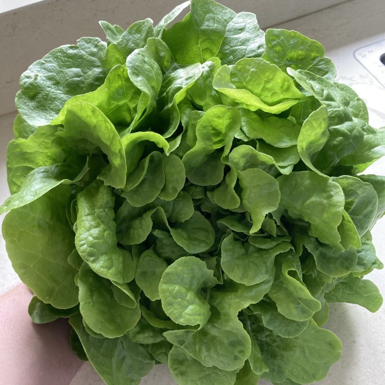 We oogsten deze week deze groene groenten: peultjes, doperwten, paksoi, andijvie, peterselie, verse look en groene en rode sla.