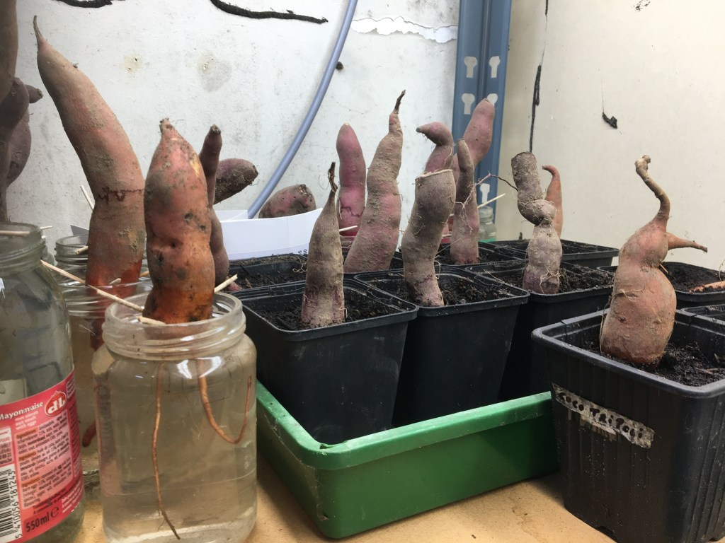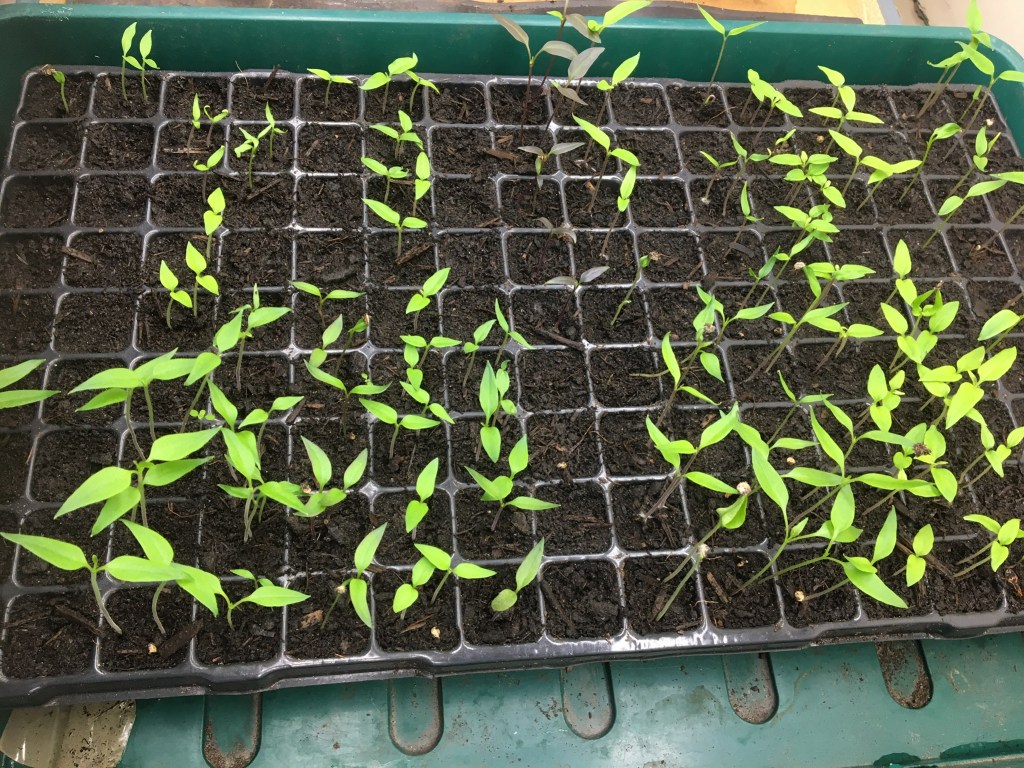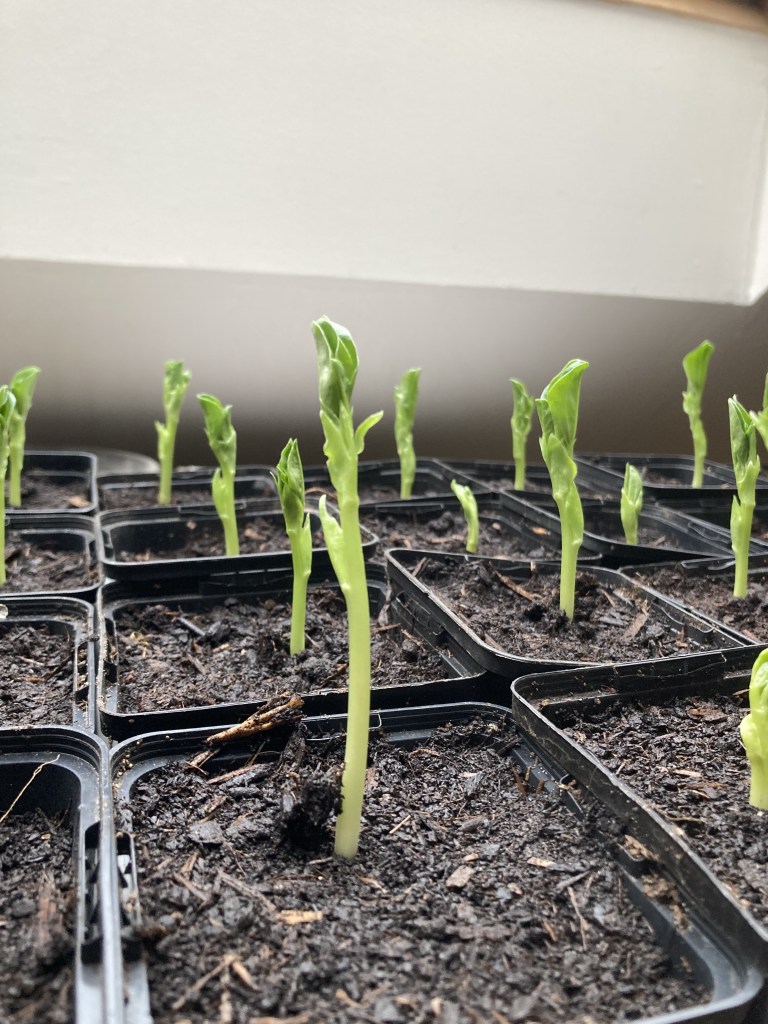 De voorbije weken lag onze tafel vol zadenzakjes en knolletjes. Potjes vullen en vol verwachting piepen of er al iets uitkomt, begint weer een ritueel te worden. En ja hoor de eerste plantjes laten zich al zien.