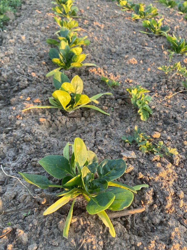 Terwijl de tomaten harden en de paprika’s nog eens een groter potje kregen in de kraamkamer, hebben we heel wat plantjes een plekje gegeven op het veld. Hieronder zie je de nieuw aangeplante spinazie en de peultjes. Ook sla, kervel, venkel en peterselie kregen een plaatsje. De broccoli, romanesco, paksoi en koolrabi staan onder doek en de radijsjes genieten van de zonnige dagen. Eerstdaags planten we prei en ui. En vandaag merkten we eindelijk de eerste kopjes asperges op.