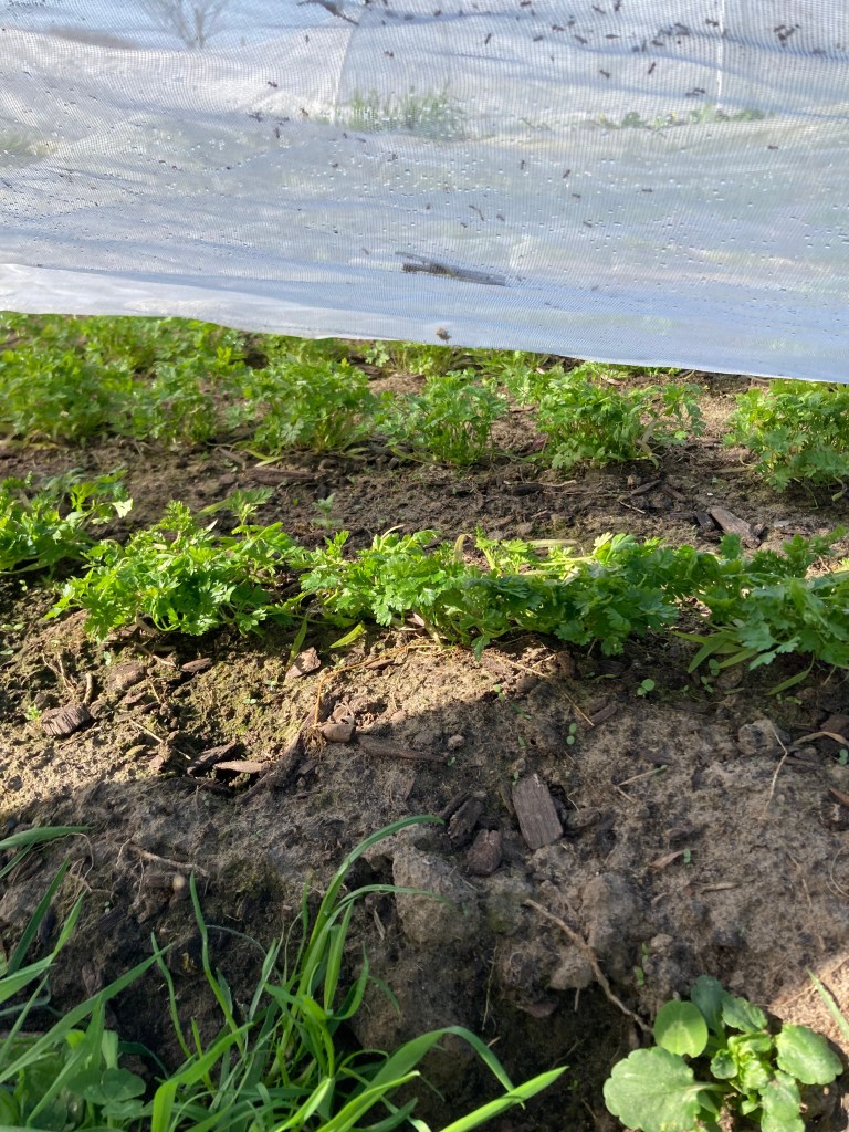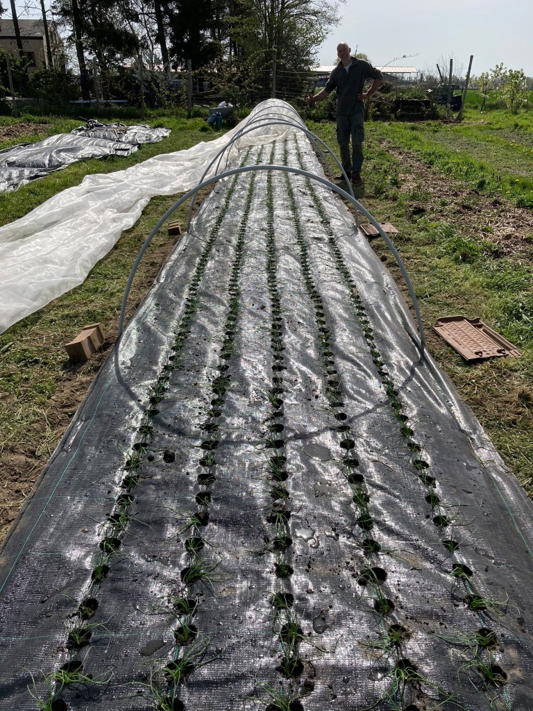 Wat een heerlijkheid om op het veld bezig te zijn. De tuinbonen groeien, de peultjes staan flink recht, de kervel staat er frisgroen bij, de spinazie toont haar grootste bladeren en de bloemkolen …. die komen bijna piepen. Tientallen kolen staan op een rijtje onder een tunnel klaar om te groeien. Honderden uien kregen een plaatsje om te ‘bollen’. Kortom, stilaan krijgt elk bed een invulling.