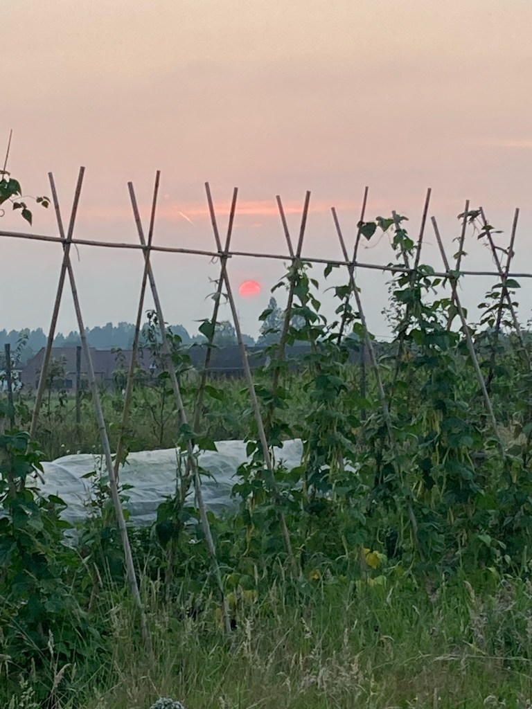En plots is het herfst. Op enkele dagen tijd lijkt het alsof de avond uren eerder intreedt. ’s Ochtends is het nog donker als de wekker gaat. Terwijl ik naar buiten tuur, verschijnt er een roze gloed, de aankondiging van een nieuwe dag. Ook de regen is terug, natte regen die in je kleren kruipt en je doet verlangen naar een haardvuur, en soep of een andere dampende warme drank. En toch lijkt het pas gisteren dat de tomaten rood werden, gaat de tijd echt zo snel? De paprika’s zijn nog maar net begonnen en daar zijn de zoete aardappelen al. Ook de eerste spruitjes kondigen zich aan. Die kleine groene bolletjes houden wel van een malse regenbui. Nog enkele dagen en ze zijn klaar om te oogsten. Voorlopig eten we nog stamppot van boerenkool, spitskoolsalade en tomatenpaprikasoep.